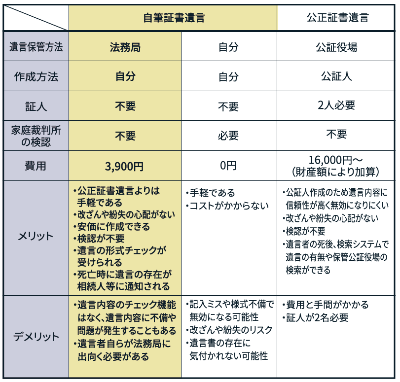 自分の手で遺言を書き、法務局に持ち込むだけなので手軽です。費用も、遺言の用紙代や住民票取得費、法務局への手数料3,900円ほどと安価。 紛失や改ざんの不安もある自筆証書遺言ですが、法務局保管ならばその心配もありません。